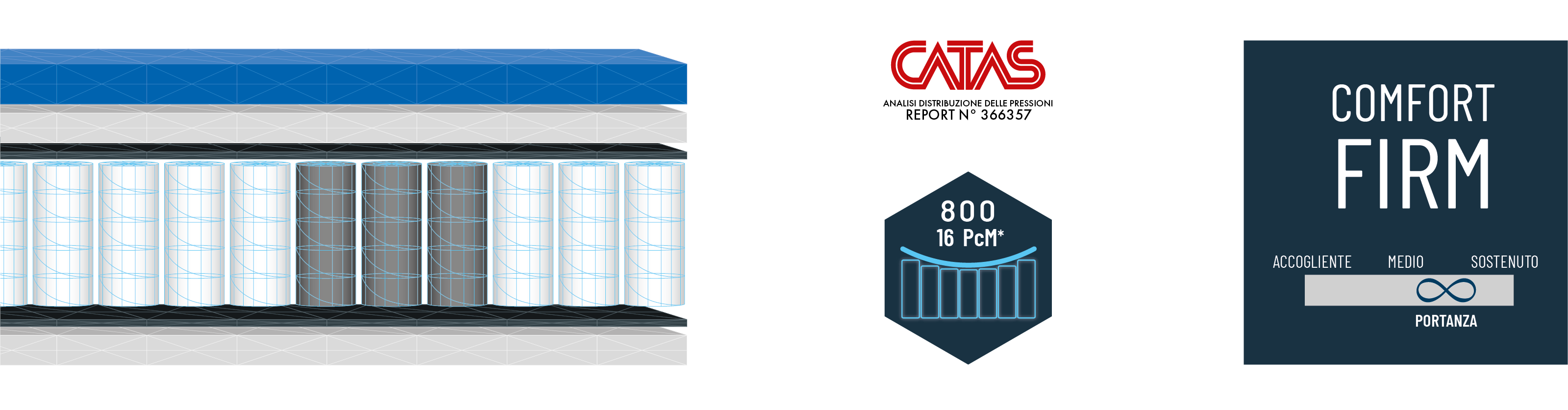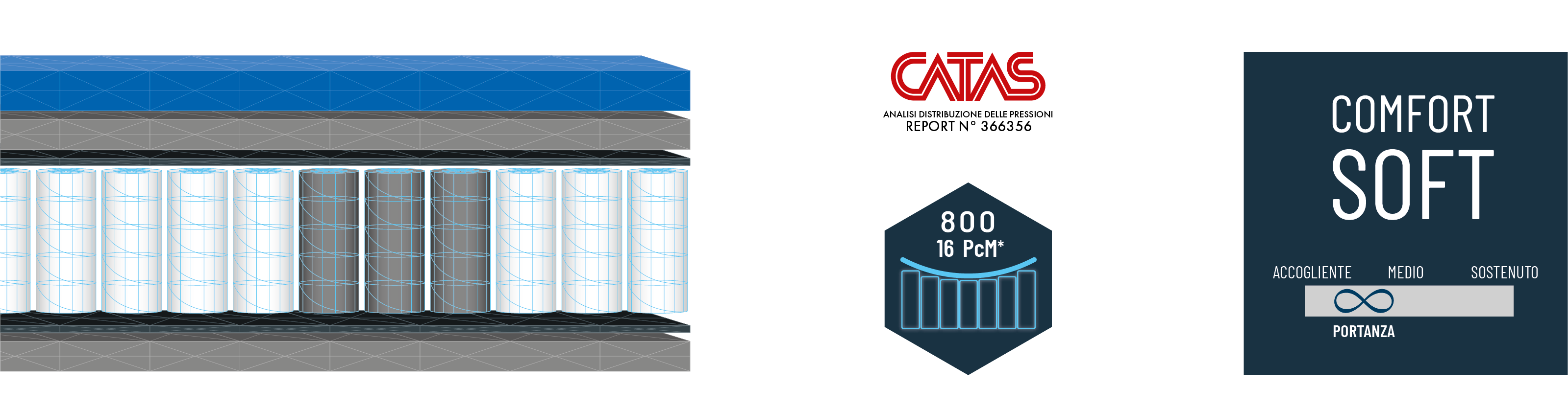 Le molle APS-Hybrid donano un’accoglienza progressiva con 7 zone differenziate: il molleggio da 800, pari a 260 al mq nella versione matrimoniale, offre 16 punti di contatto per metro lineare.